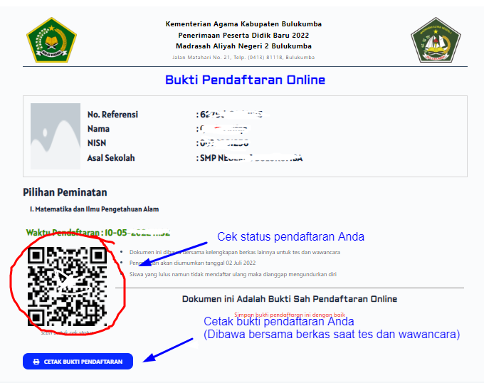 Anda bisa langsung mencetak bukti pendaftaran di halaman tersebut seperti yang ada pada gambar di atas.