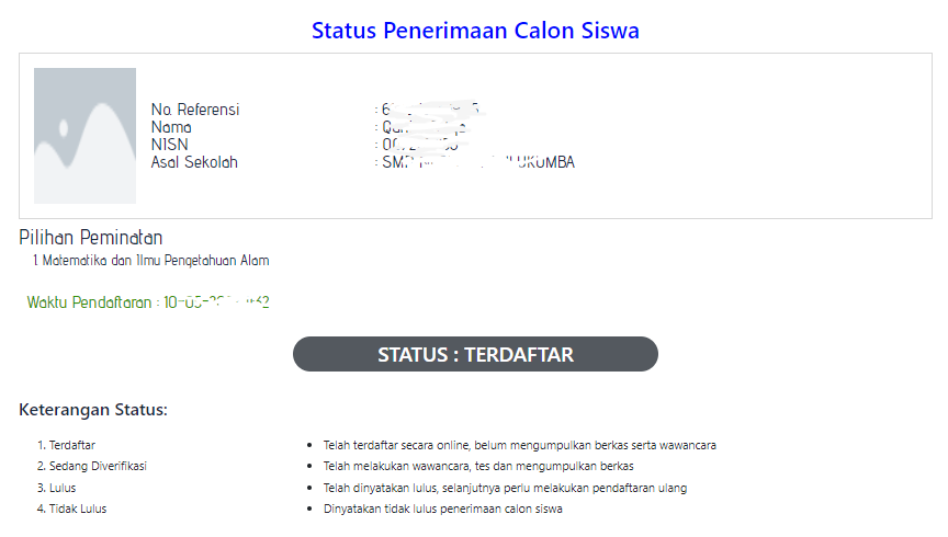 Jika Anda melakukan scan barcode, maka Anda bisa melihat status pendaftaran Anda saat ini, seperti pada gambar di bawah ini, statusnya “TERDAFTAR“, sesuai dengan keterangan pada halaman tersebut, status “TERDAFTAR” adalah telah menyelesaikan pendaftaran secara online namun belum mengumpulkan berkas serta tes dan wawancara.